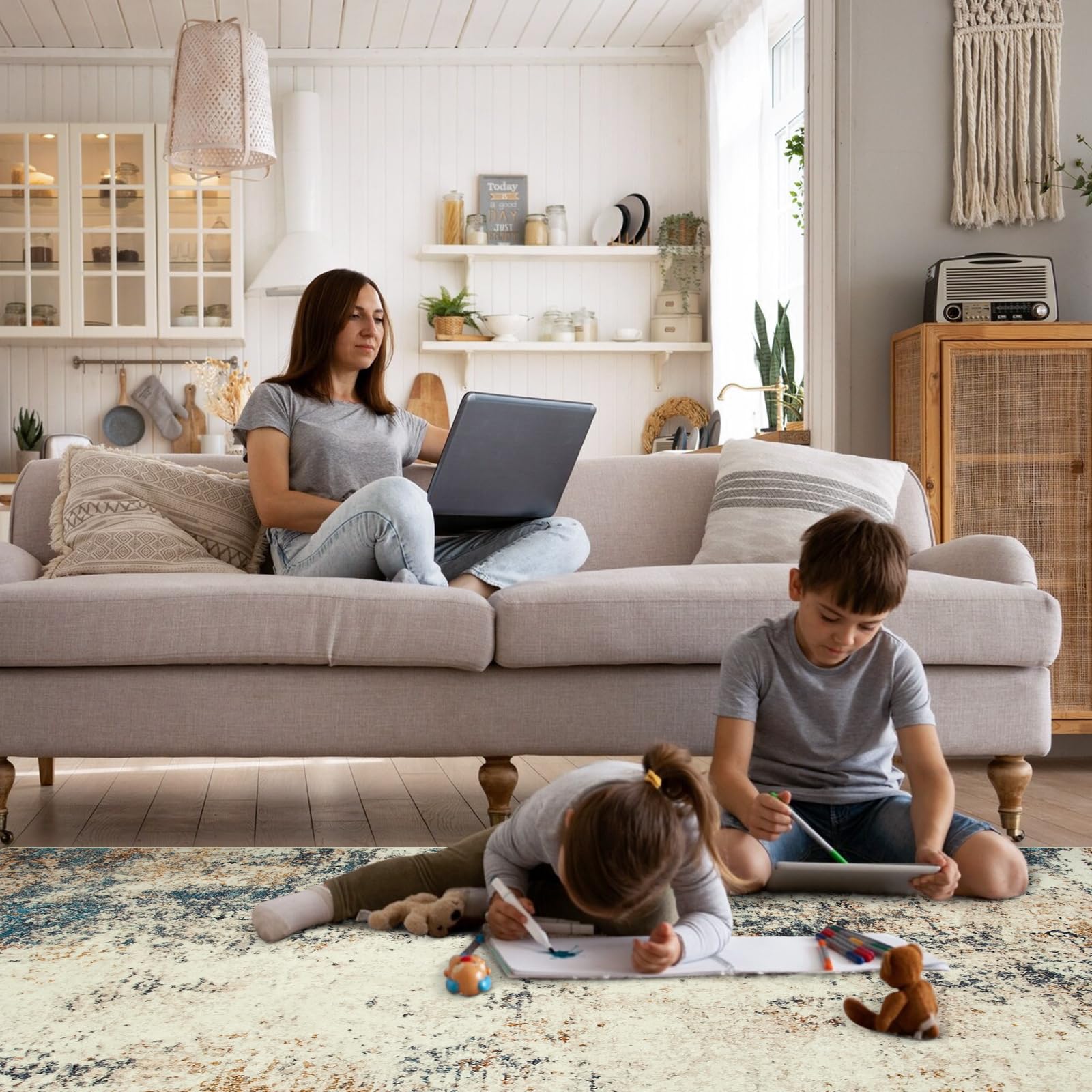 Add a unique touch of color to your bedroom/living room with the RUG ROBOT modern abstract ink painting rug collection. Designed with a delicate palette, color blocks are blended in a freely splashed form, with no regular boundaries yet harmonious unity, combining artistic spontaneity with home adaptability. This versatile style makes this modern rug suitable for living room, bedroom, kitchen, dining room, and more. Designed with skin-friendly cashmere-like low pile, our rugs for living room will feel as soft as clouds when you walk or lie on this throw carpet barefoot. This 0.24 inches thickness facilitates easy door opening and seamless vacuuming, eliminating the risk of tripping. These bedroom rugs have a TPE non-slip backing, which can grip firmly on hardwood and tile floors, making this large area rug a safe choice for families with pets. Designed for easy daily cleaning and maintenance, our washable area rugs are stain-resistant and waterproof. For spills, just wipe with a damp cloth for quick cleaning. Regular vacuuming only requires a low-power vacuum cleaner to keep the rug clean. RUG ROBOT accent carpet are the perfect choice for your busy family life.