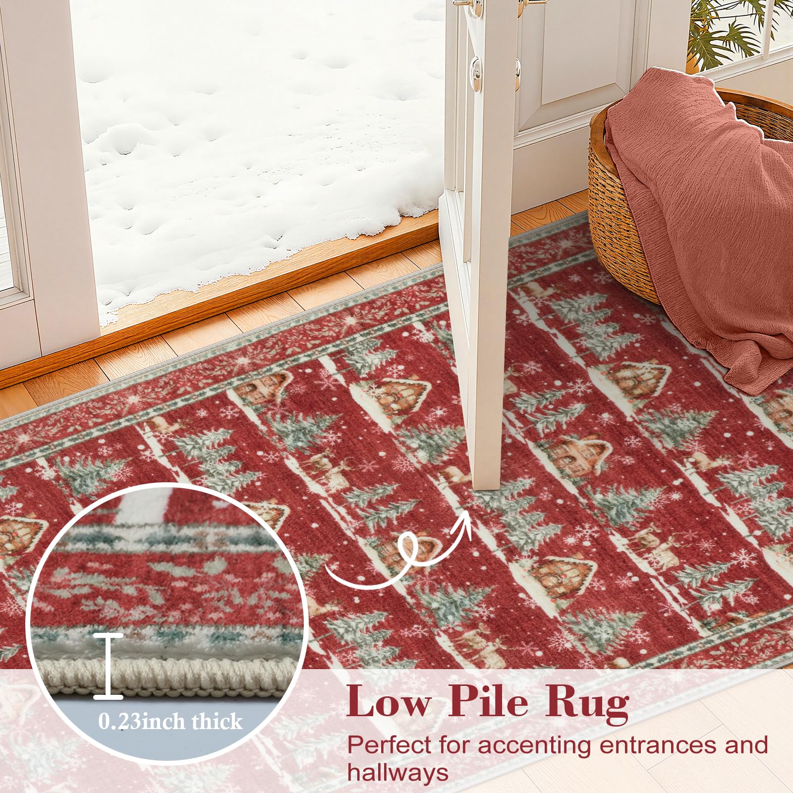 - Soft and Low Pile: The Christmas doormat is made from faux wool material, offering comfort and sturdy with reinforced edges. 0.23 inch thick hallway rug which glides smoothly over thresholds, making it a good choice for entryways or bathroom carpet