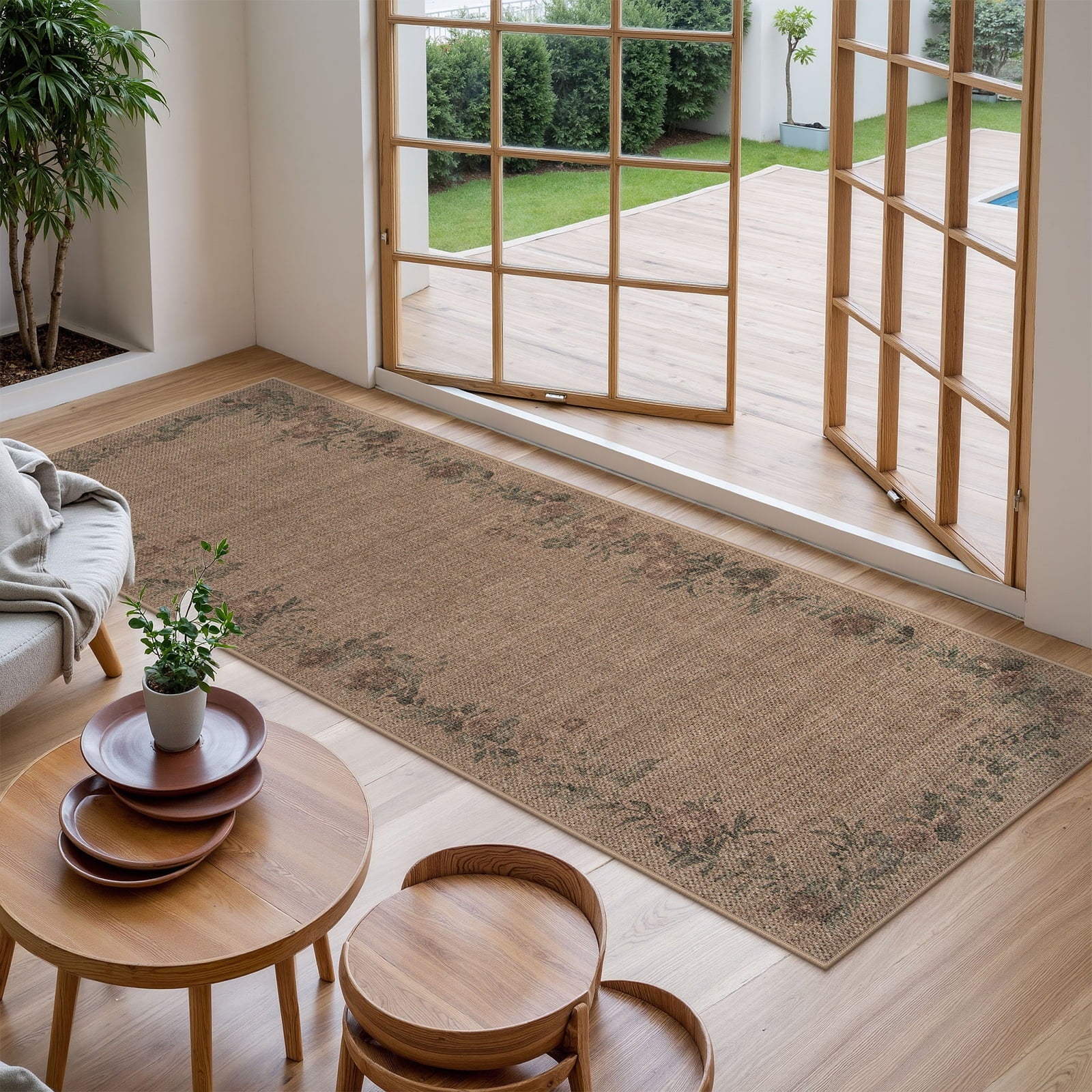 SUNDEREY Floral Easy Jute Rug,Area Rug Washable Bedroom Rug,Easy Jute Indoor Outdoor Carpet, Farmhouse Non Slip Khaki Floor Rug for Dining Room Office Entrance Kitchen
