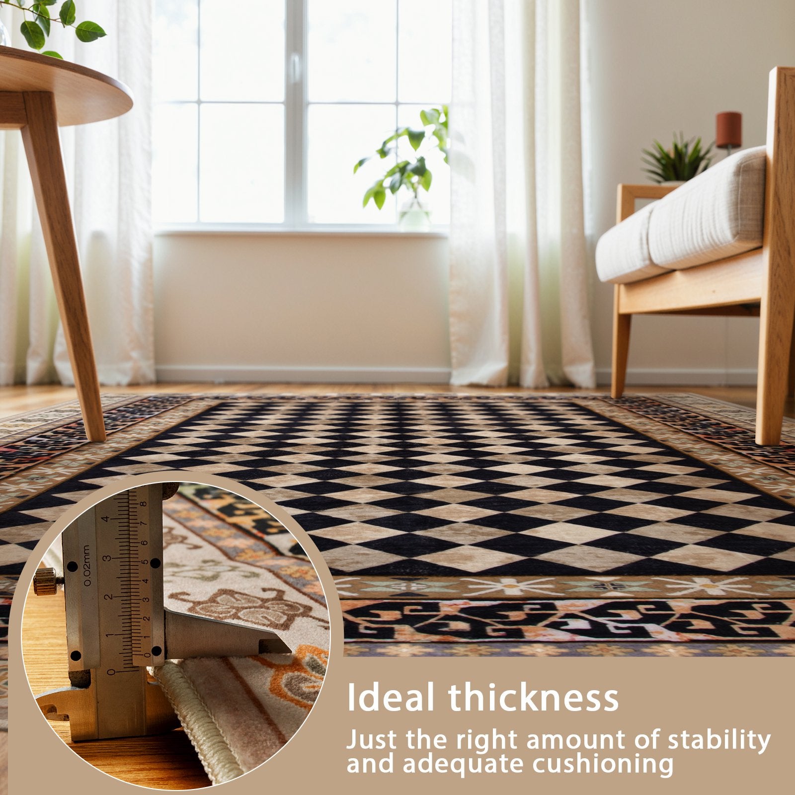 The RUG ROBOT boho diamond trellis rug embodies a modern and contemporary feel while incorporating the playfulness of a vintage board game. The regular geometric arrangement of the checkerboard pattern creates a sense of order, complemented by a black decorative band featuring a geometric floral pattern. It exudes a sense of cultural heritage without appearing dated, perfect for urban dwellers seeking a touch of exotic charm while still pursuing a minimalist aesthetic. Available in a variety of sizes, it's suitable for any room, including the living room, bedroom, dining room, kitchen. This modern rug is crafted from faux cashmere for a warm, natural feel that's soft and comfortable underfoot. Its grippy, non-slip TPE backing ensures this area rug remains secure and safe. Our trellis rug features a low 0.2-inch pile, making it easy to place in entryways and under furniture without obstructing door openings. A good rug deserves easy care. Our machine-washable rugs require only cold washing in the washing machine and tumble dry on low. Daily care requires only vacuuming or a gentle wipe with a cloth. They are odorless and pet-friendly. Bring life to your room with the RUG ROBOT checkerboard rug.